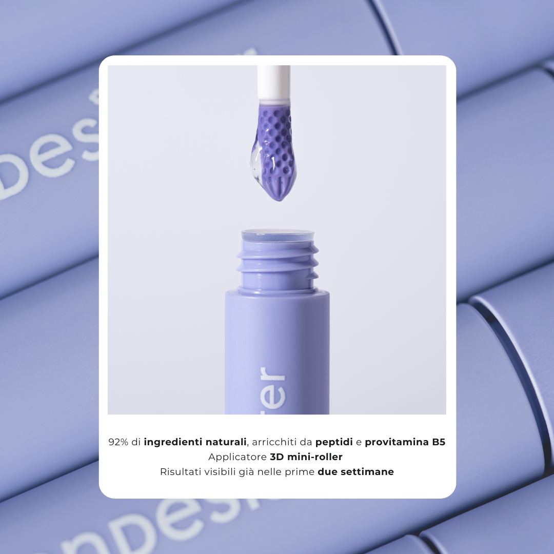 Il primo siero 2in1 per ciglia e sopracciglia che dopo 2 settimane ne aumenta lunghezza e volume. Utilizzalo almeno due volta al giorno con l’innovativo applicatore 3D mini roller per un effetto sensoriale indimenticabile.